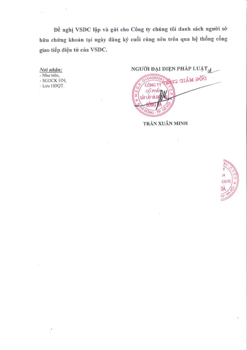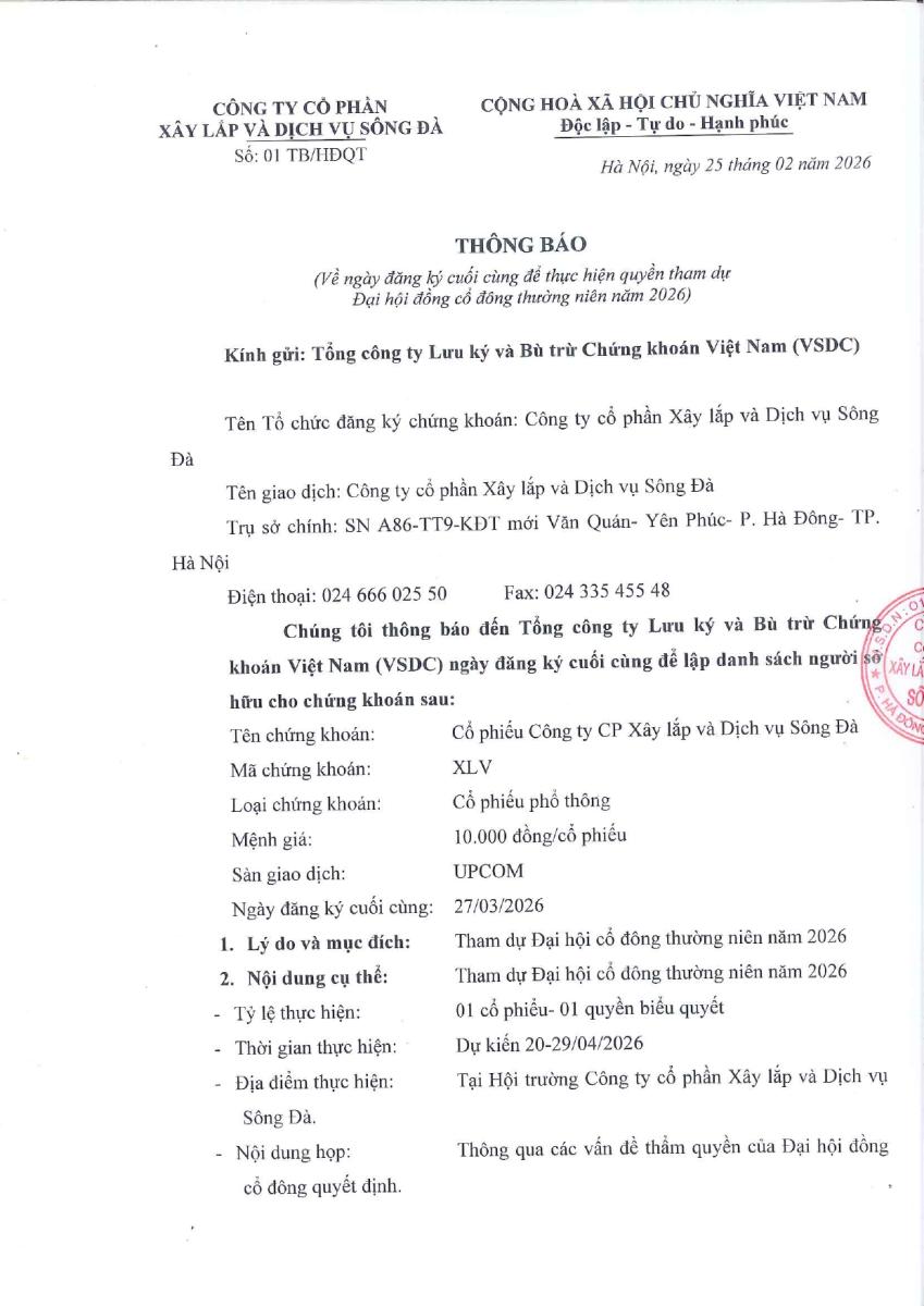 Hội đồng quản trị Công ty cổ phần Xây lắp và Dịch vụ Sông Đà (Mã CK: XLV) trân trọng thông báo về ngày đăng ký cuối cùng để thực hiện quyền tham dự Đại hội đồng cổ đông thường niên năm 20226 như sau: